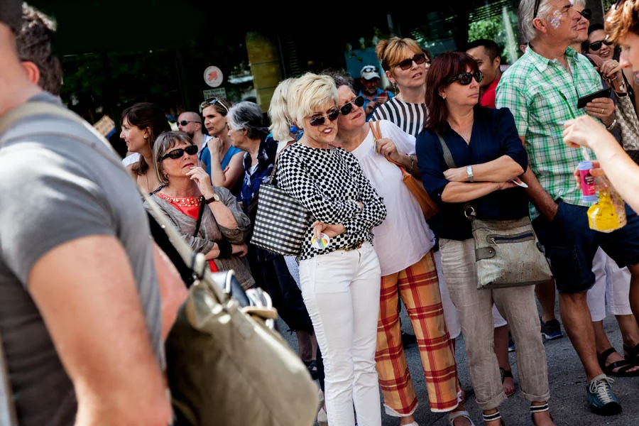 Une foule contrainte, ou solidaire, ou moqueuse, ou contrariée. Une foule passive et immobile, qui regarde sans trop regarder, comme se frôler sans se rencontrer, une parade...