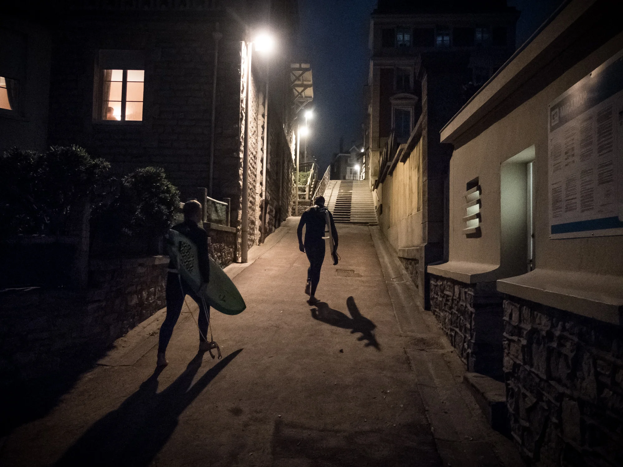 Deux surfeurs de nuit, regagnant discrètement leurs appartements dans les beaux quartiers, après une session de glisse à la tombée du jour. Presque une scène extraite du film Only Lovers Left Alive. Nous sommes ici à Biarritz, «ville impériale», lieu de rencontre entre aristocrates et autres people en tous genres depuis le milieu du XIXe siècle, lorsque l’impératrice Eugénie de Montijo, compagne de Napoléon III, fit de ce petit bourg basque son lieu de villégiature.