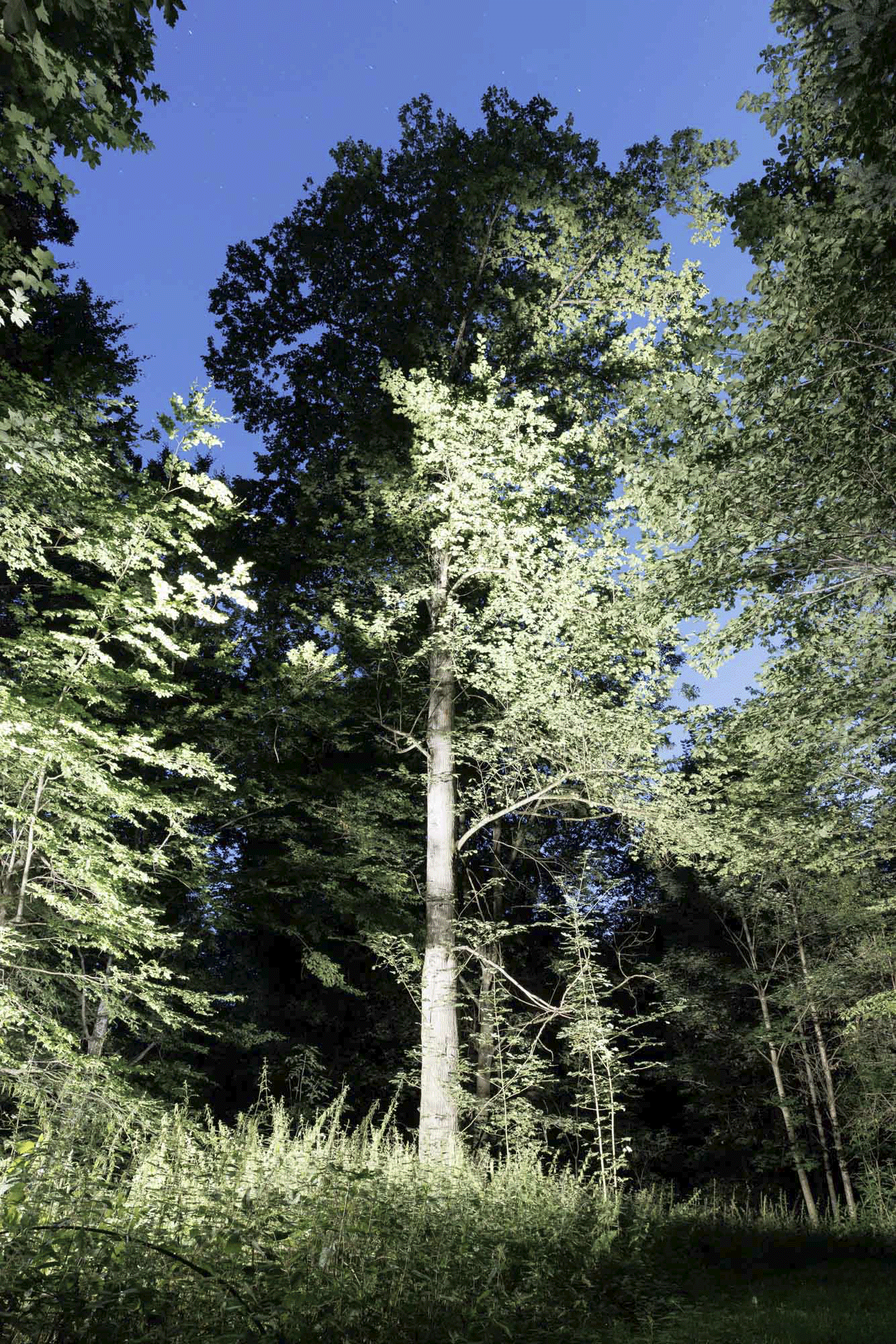 “A l'orée du bois du Piamont, du côté de la ferme du même nom, se profile un châtaignier qui semble danser vers la lumière. Il se dirige vers le soleil car cette essence a besoin d'un milieu sec et chaud. C'est pourquoi les châtaigniers sont d'ailleurs plutôt rares dans nos régions. La légende dit qu'autrefois, à cet endroit, il y avait une vigne, ce qui porte à croire que le terrain est propice aux espèces gourmandes en chaleur.”
